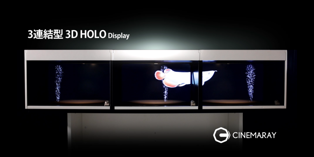 よりダイナミックな演出を実現するため、3台のホログラムディスプレイを連結し、映像が流れるように繋がる新機能を開発。水槽に見立てた3連ボックス内で、深海魚が優雅に泳ぎ回る様子を再現。大型ホログラム演出・空間デザインに最適な事例です。