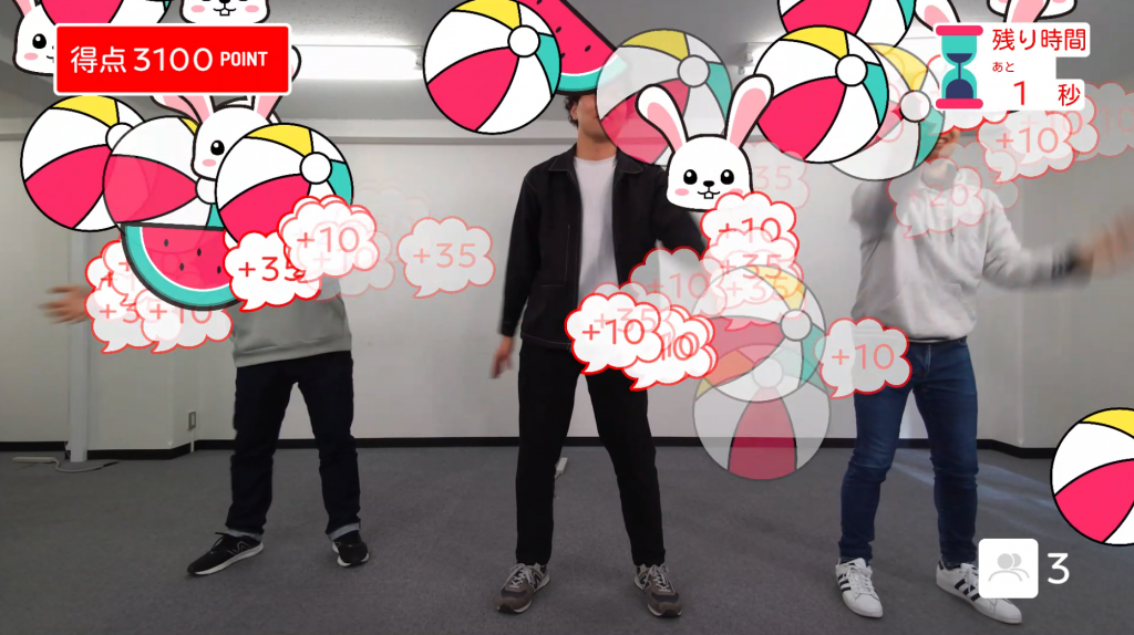最大6人まで同時参加できるインタラクティブゲームコンテンツです。コントローラーや複雑な操作は不要で、「みんなで楽しむ」ことを重視。壁面に投影された映像に合わせ、上から流れてくるオブジェクトの位置に手を挙げると、モーションセンサーがタッチを認識します。非接触操作・ジェスチャー認識を活用した体験型ゲームです。