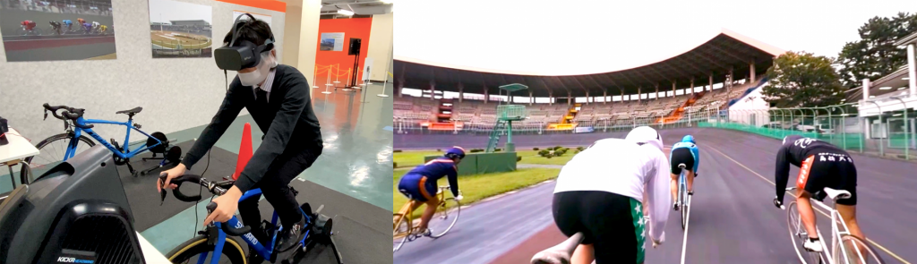 リアルな競輪体験ができるVRコンテンツです。ローラー台に乗りながらVRの世界に入ることで、プロの選手たちと一緒に走る現実にはない体験を可能にしました。タブレットアプリで複数機器の接続および制御を行い、またVR端末側の再生情報を受け取り映像を表示させます。