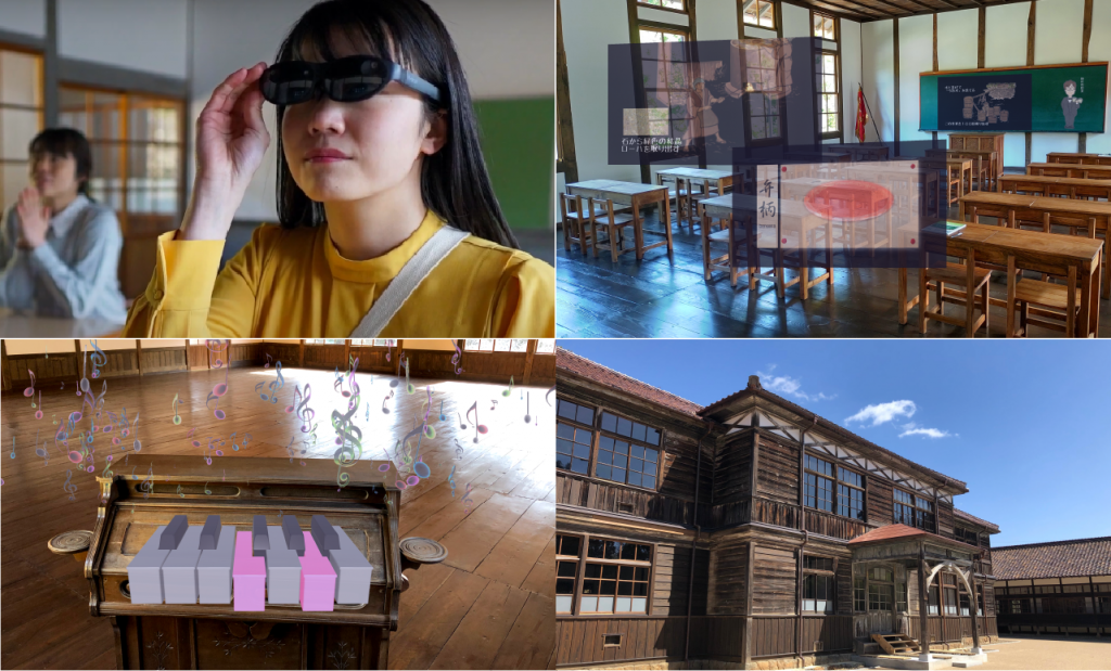 MRグラスを装着しながら岡山県指定重要文化財「旧吹屋小学校」を回遊し、各教室内に散りばめられたMRコンテンツで街の歴史や人々の暮らしなどタイムスリップしたような体験ができます。ハンドトラッキング技術もでき、軽量なグラス型形状のためどんな方でも気軽に体験ができます。