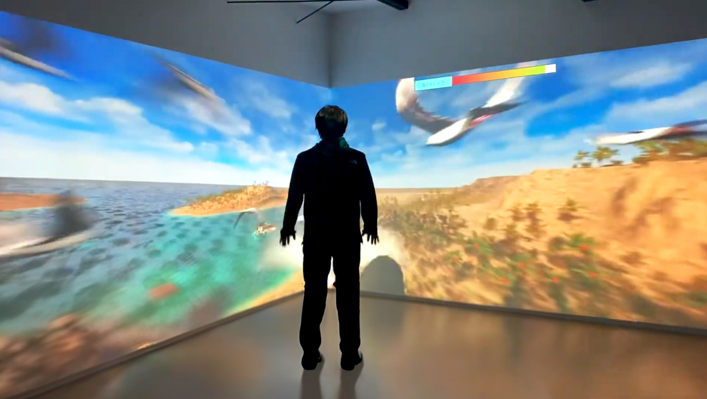 壁面に投影された映像の中に入り込むことができる没入型インタラクティブコンテンツです。海や海岸の景色からスタートし、ゴミ拾いや空を飛ぶなど、さまざまな体験が可能。体験を通じて環境問題への意識向上を目的に制作しました。プロジェクションマッピング+モーションセンサー技術を活用した事例です。