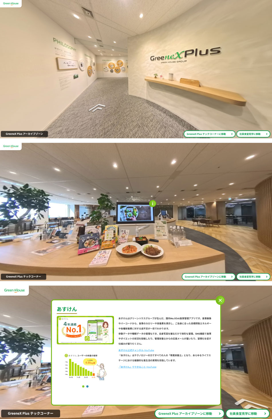 制作にあたっては、グリーンハウス様の本社42階エントランス、およびイノベーションセンター「GreeneX Plus」内を高画質360°カメラで撮影。直感的な操作で空間内を自由に移動できる、没入感の高いバーチャル体験を実現しました。